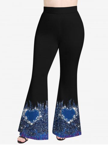 Plus Size Heart Sparkling Sequin Glitter 3D Print Flare Pants - Black - 1x