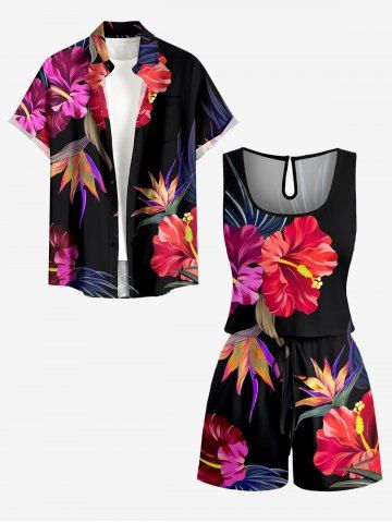 Graphic Pants > Plus Size Hibiscus Flower Leaf Print Cinched Hawaii Romper