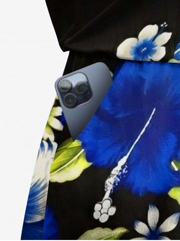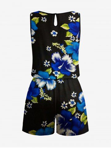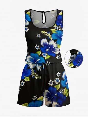 Plus Size Hibiscus Flower Leaf Print Hawaii Drawstring Pocket Romper - Black - S
