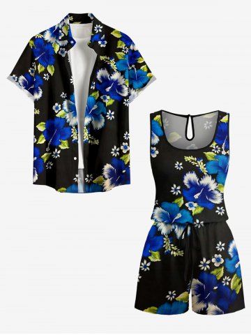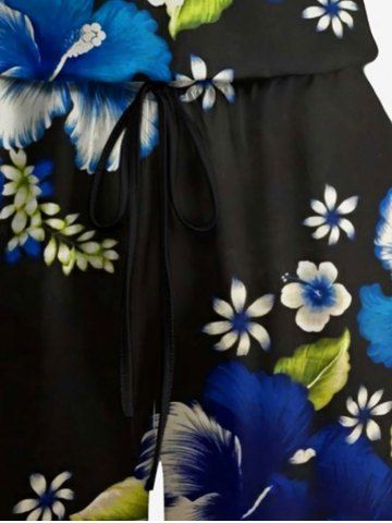 Plus Size Hibiscus Flower Leaf Print Hawaii Drawstring Pocket Romper - Black - 1x