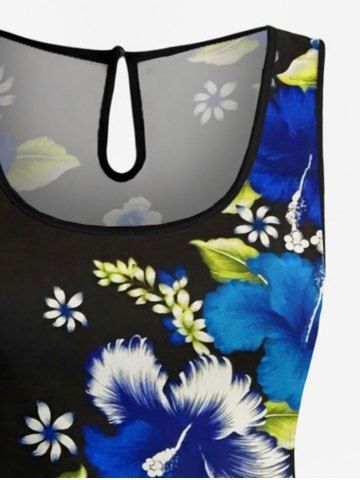 Plus Size Hibiscus Flower Leaf Print Hawaii Drawstring Pocket Romper - Black - 4x