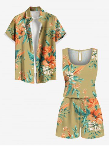 Plus Size Hibiscus Flowers Leaf Print Cinched Hawaii Romper - Tan - 2x