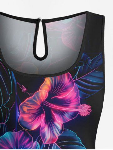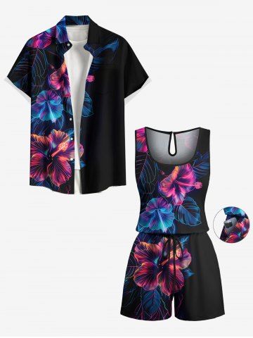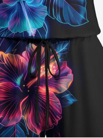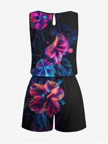 Plus Size Hibiscus Flowers Leaf Tropical Print Cinched Hawaii Romper - Black - Xxs
