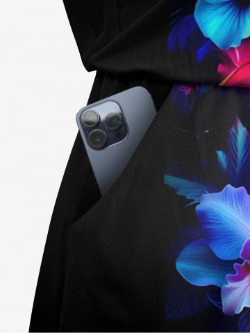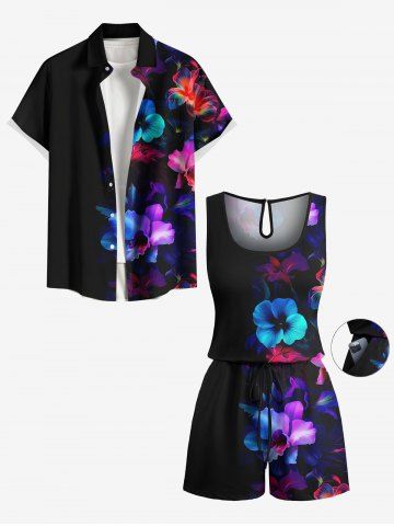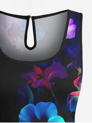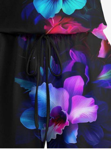 Plus Size Hibiscus Flowers Print Cinched Hawaii Romper - Black - M