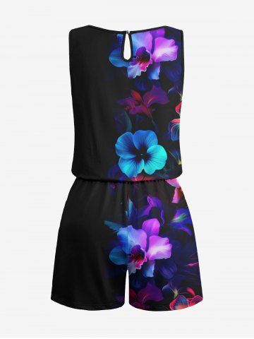 Plus Size Hibiscus Flowers Print Cinched Hawaii Romper - Black - 6x