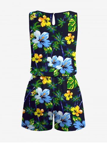 Plus Size Hibiscus Flowers Tropical Leaf Oil Painting Print Hawaii Romper - Black - 5x