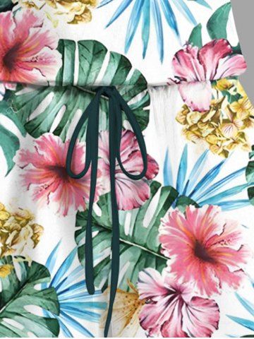Plus Size Hibiscus Flowers Tropical Leaf Print Cinched Hawaii Romper - White - Xs