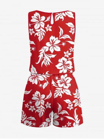 Plus Size Hibiscus Flowers Tropical Leaf Print Cinched Hawaii Romper - Red - 3x