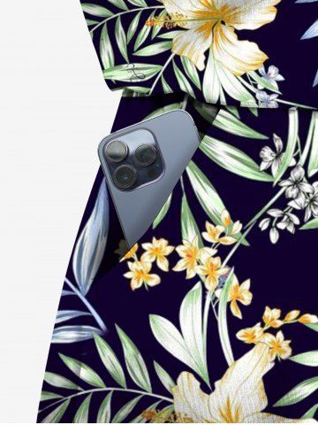 Plus Size Lily Flower Leaf Branch Print Hawaii Drawstring Pocket Jumpsuit - Black - Xs