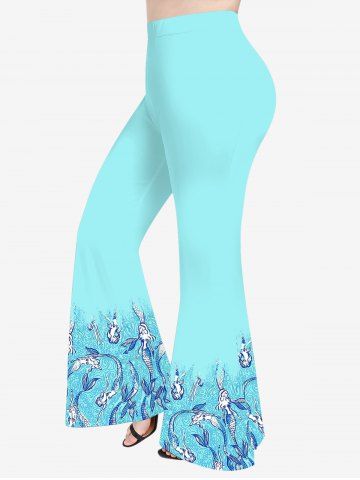 Plus Size Mermaid Water Wave Print Flare Pants - Light Blue - 1x