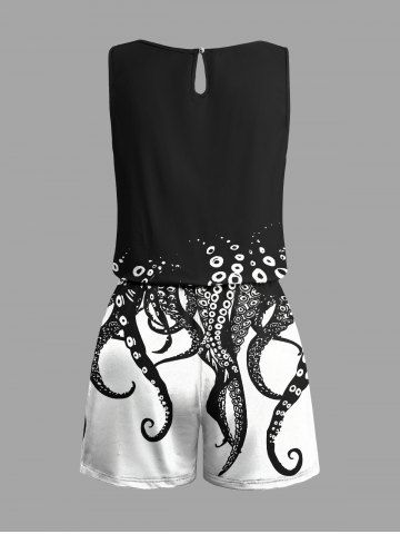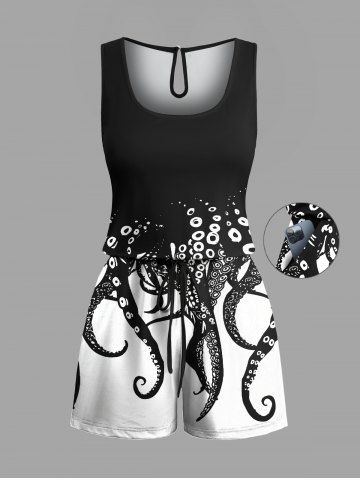 Plus Size Octopus Two Tone Print Hawaii Drawstring Pocket Romper - Black - Xs