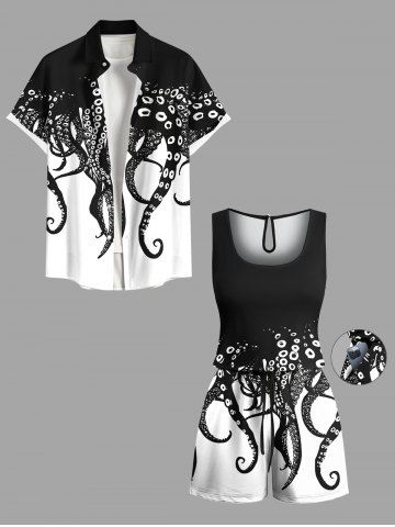 Plus Size Octopus Two Tone Print Hawaii Drawstring Pocket Romper - Black - L