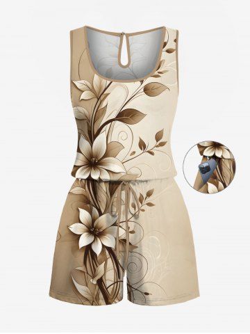 Graphic Pants > Plus Size Ombre Flower Branch Curve Print Hawaii Drawstring Pocket Romper