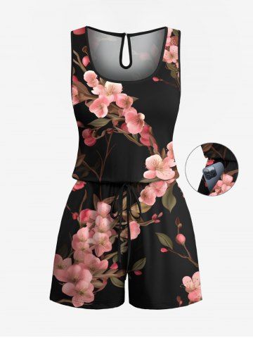 Plus Size Ombre Flower Branch Print Hawaii Drawstring Pocket Romper - Black - M