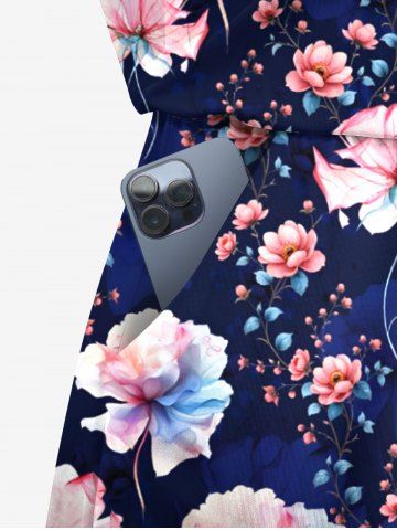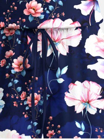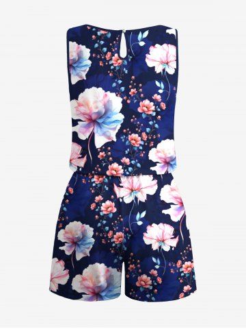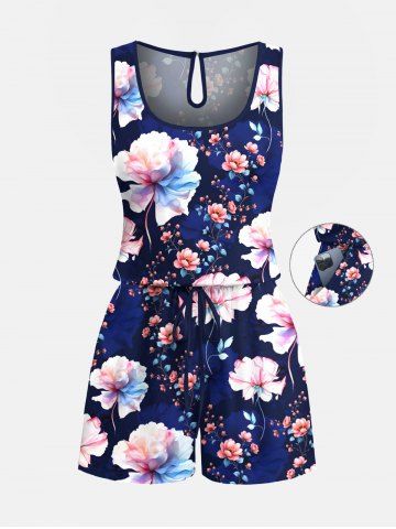 Plus Size Ombre Flower Print Hawaii Drawstring Pocket Romper - Deep Blue - L