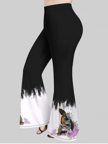 Plus Size Owl Colorblock Ink Painting Print Flare Pants - Black - 2x