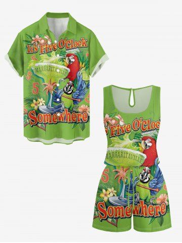Plus Size Parrot Fruit Juice Flowers Leaf Print Cinched Hawaii Romper - Green - L