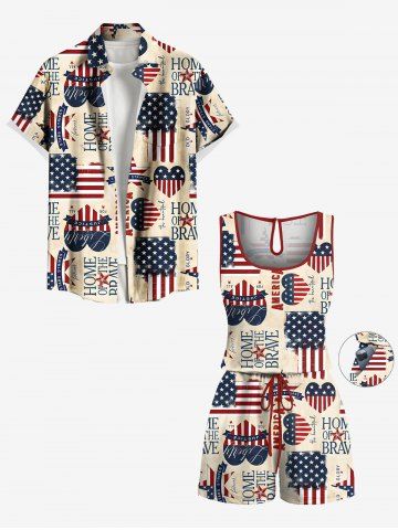 Plus Size Patriotic American Flag Heart Letters Print Hawaii Drawstring Pocket Romper - Light Coffee - 4x