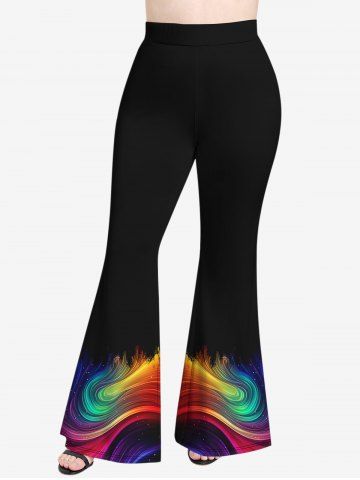 Plus Size Rainbow Color Paint Swirls Print Flare Pants - Black - 1x