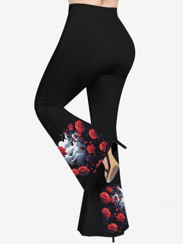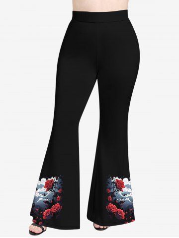 Plus Size Rose Flower Cloud Print Flare Pants - Black - 4x