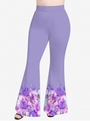 Plus Size Rose Flower Leaf Glitter Sparkling Sequin 3D Print Flare Pants - Purple - L