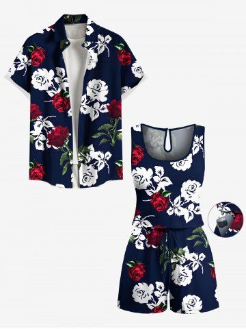 Plus Size Rose Flower Leaf Print Hawaii Drawstring Pocket Romper - Black - M