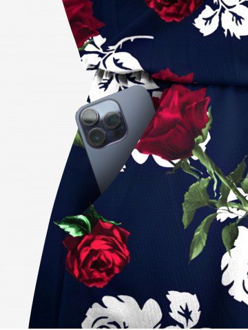 Plus Size Rose Flower Leaf Print Hawaii Drawstring Pocket Romper - Black - 4x