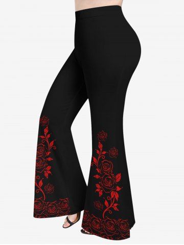 Graphic Pants > Plus Size Rose Flower Leaf Print Pull On Flare Pants