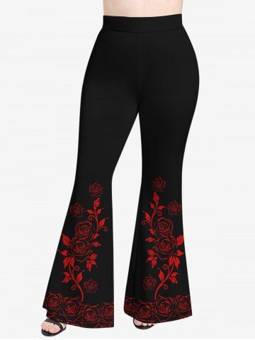 Plus Size Rose Flower Leaf Print Pull On Flare Pants - Black - 1x