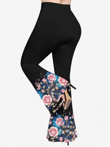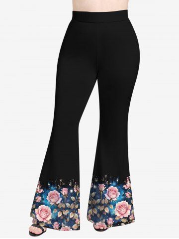 Plus Size Rose Flower Leaf Star Glitter 3D Print Flare Pants - Black - 5x