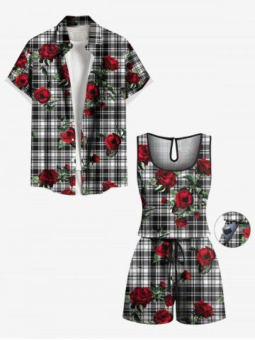 Plus Size Rose Flower Leave Plaid Print Hawaii Drawstring Pocket Romper - Black - 6x