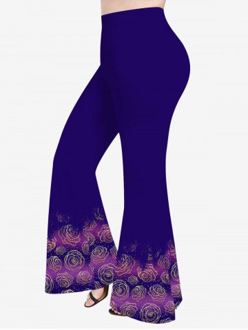 Plus Size Rose Flower Ombre Colorblock Stripe Print Flare Pants - Deep Blue - L