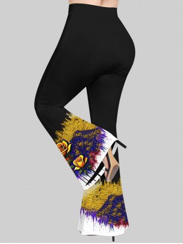 Plus Size Rose Flower Paint Drop Print Flare Pants - Black - L