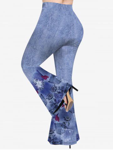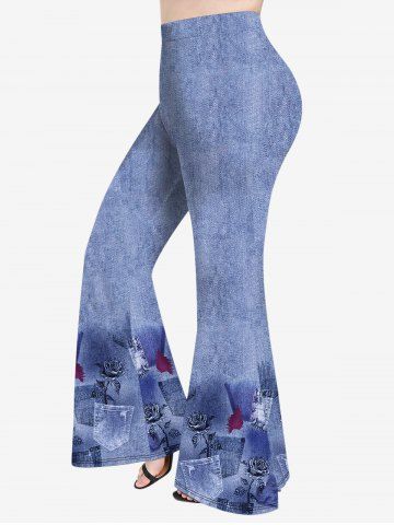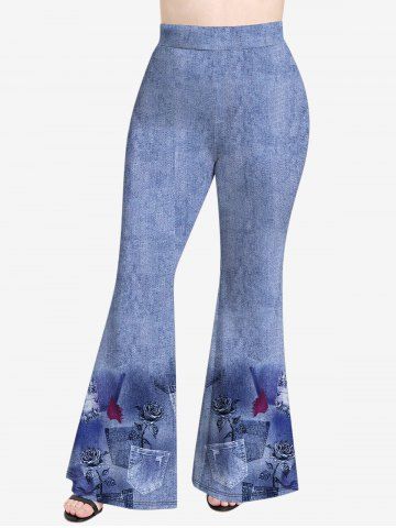 Plus Size Rose Flower Pocket Ombre Denim Print Pull On Flare Pants - Blue - L