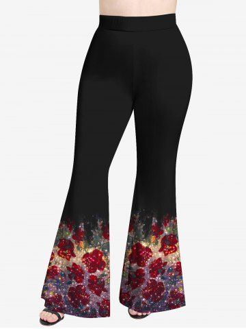 Plus Size Rose Leaf Glitter Galaxy Print Flare Pants - Deep Red - Xs