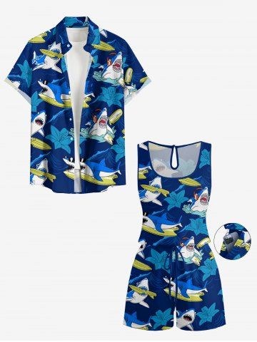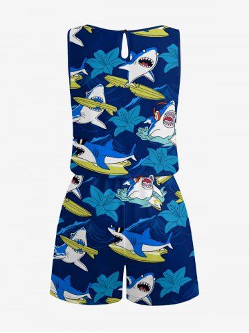 Plus Size Shark Sea Waves Hibiscus Flower Print Hawaii Drawstring Pocket Romper - Deep Blue - Xxs