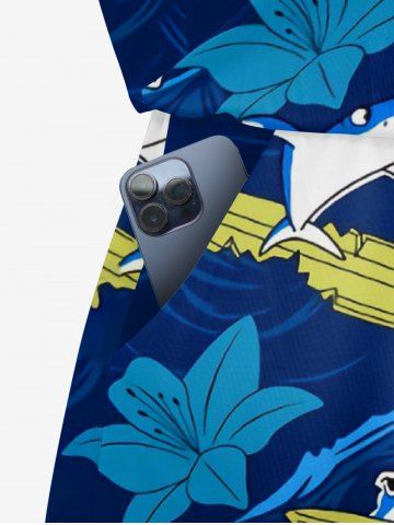 Plus Size Shark Sea Waves Hibiscus Flower Print Hawaii Drawstring Pocket Romper - Deep Blue - 6x