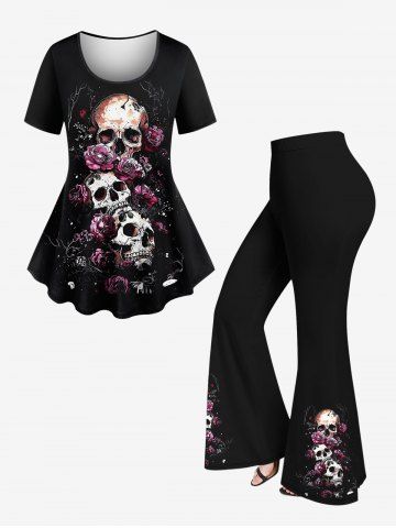 Plus Size Skull Rose Flower Branch Print Flare Pants - Black - Xs