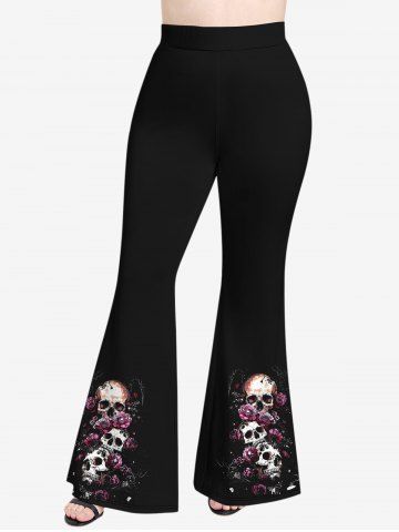 Plus Size Skull Rose Flower Branch Print Flare Pants - Black - 1x