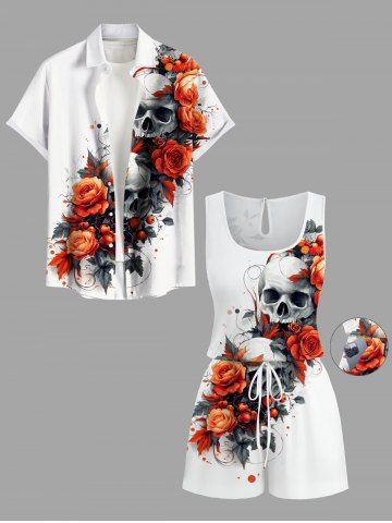 Plus Size Skull Rose Flower Print Halloween Drawstring Pocket Romper - White - 5x
