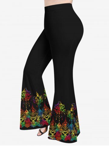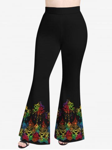 Plus Size Skulls Eye Floral Tassel Crown Print Flare Pants - Black - M