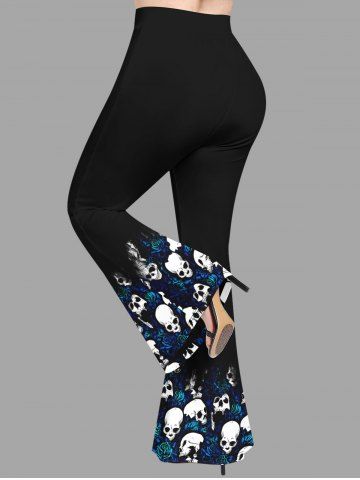 Plus Size Skulls Rose Flowers Print Flare Pants - Black - 3x