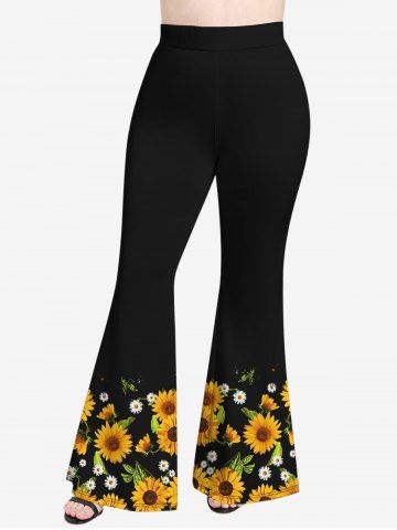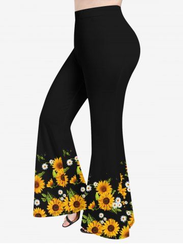 Plus Size Sunflower Daisy Print Pull On Flare Pants - Black - 4x