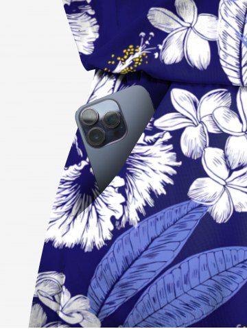Plus Size Tropical Flower Leaf Print Cinched Hawaii Jumpsuit - Deep Blue - Xxs