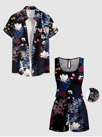 Plus Size Tropical Leaf Branch Flower Print Hawaii Drawstring Pocket Romper - Black - Xs