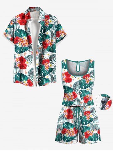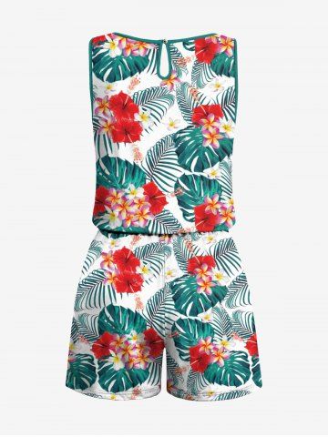 Plus Size Tropical Leaf Flower Print Cinched Hawaii Romper - Green - 1x