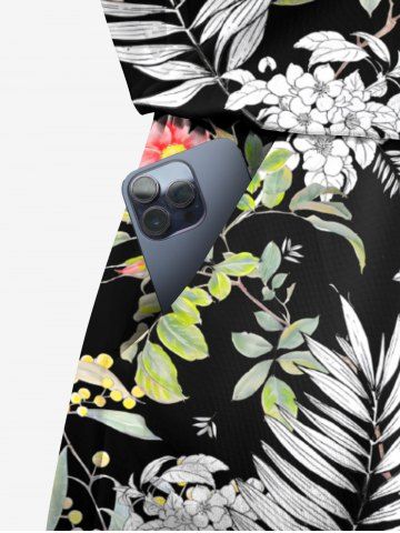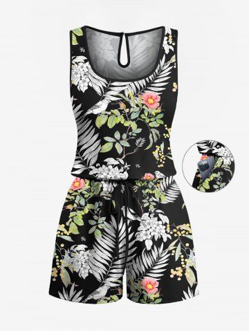 Plus Size Tropical Leaf Flower Print Hawaii Drawstring Pocket Romper - Black - 6x