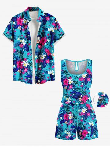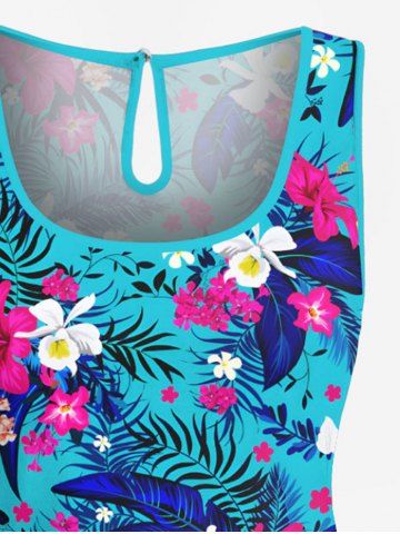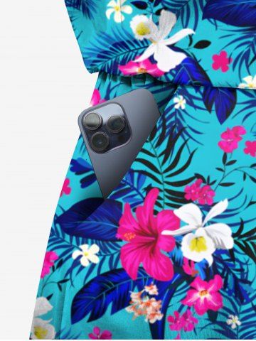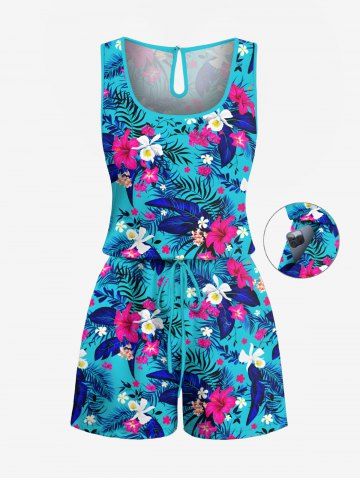 Plus Size Tropical Leaf Hbiscus Flowers Print Cinched Hawaii Romper - Sky Blue - Xs