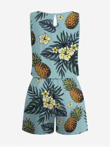 Plus Size Tropical Leaf Hibiscus Flower Pineapple Print Hawaii Drawstring Pocket Romper - Blue - Xs