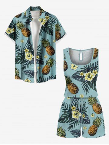 Graphic Pants > Plus Size Tropical Leaf Hibiscus Flower Pineapple Print Hawaii Drawstring Pocket Romper